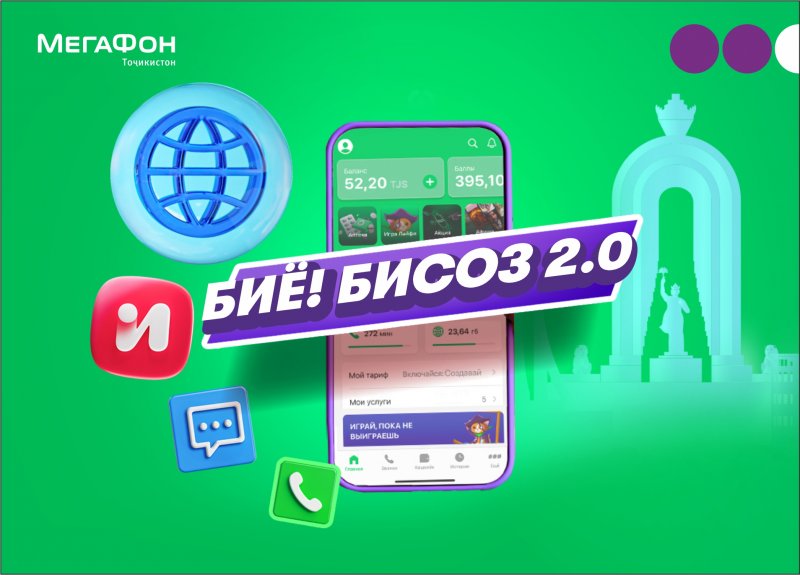 ДУШАНБЕ, 17.09.2025 /АМИТ «Ховар»/. Ширкати «МегаФон Тоҷикистон» тарофаи нави «Биё! Бисоз 2.0»-ро амалӣ намуд, ки ба муштариён барои мустақилона ташкил намудани тарофаи худ имкон медиҳад. Ин пешниҳод дар бозори хизматрасониҳои телекоммуникатсионии ҷумҳурӣ нодир ба ҳисоб рафта, зимни он ба истифодабарандагон зиёда аз 22 ҳазор бастаи хизматрасониҳо дастрас мегарданд.