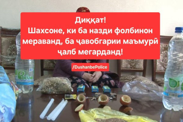 Дар ин самт аз ҷониби кормандони милитсияи ҷумҳурӣ ҳамарӯза дар саросари мамлакат амалиёти санҷишӣ гузаронида мешаванд. Чанде пеш аз ҷониби кормандони шуъбаи Вазорати корҳои дохилӣ дар ноҳияи Сино шаҳрванд Ҳисиёнбӣ Мирзоева зимни машғул шудан ба фолбинӣ дастгир карда шуд. Нисбат ба номбурда бо моддаи 482 Кодекси ҳуқуқвайронкунии маъмурии Ҷумҳурии Тоҷикистон санади маъмурӣ тартиб дода шуд. Бо Қарори Суд нисбат ба ӯ ба андозаи 80 нишондиҳанда барои ҳисобҳо, баробар ба 6 ҳазор сомонӣ ҷаримаи маъмурӣ таъйин гардид.