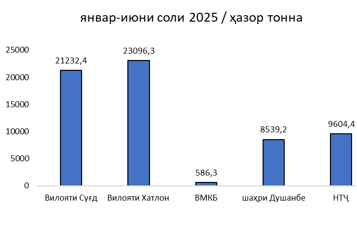 Сохтори боркашонӣ дар сатҳи минтақаҳои ҷумҳурӣ бозгӯи он аст, ки дар моҳҳои январ – июни соли 2025 дар вилояти Суғд 21 232,4 ҳазор тонна бор кашонида шудааст, ки 33,7 фоизи ҳаҷми умумии боркашониро ташкил медиҳад. Мутаносибан дар вилояти Хатлон – 23 096 ҳазор тонна (36,6 фоиз), Вилояти Мухтори Кӯҳистони Бадахшон – 586,3 ҳазор тонна (0,9 фоиз), шаҳри Душанбе – 8539,2 ҳазор тонна (13,6 фоиз) ва дар ноҳияҳои тобеи ҷумҳурӣ – 9604,4 ҳазор тонна (15,2 фоиз) бор кашонида шудааст (Диаграммаи №2).