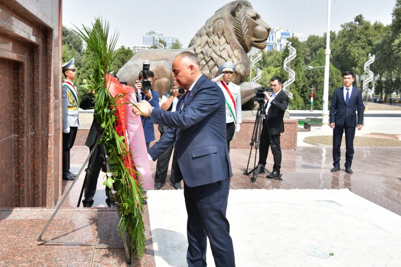 Раиси Жогорку Кенеши Ҷумҳурии Қирғизистон дар пояи муҷассамаи Исмоили Сомонӣ гулчанбар гузошт