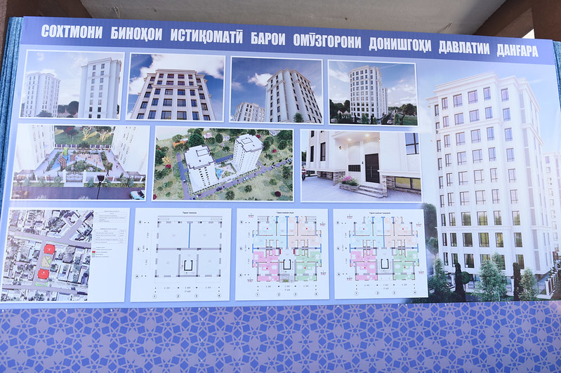 Ҳарду бино аз нуҳ ошёна иборат буда, 36 хонаи дуҳуҷрагӣ бо масоҳати 67,84 метри мураббаъ ва 36 хонаи якҳуҷрагӣ бо масоҳати 52,80 метри мураббаъ пешбинӣ гардидааст, ки барои таъмини 72 оилаи омӯзгор бо манзили истиқоматӣ пешбинӣ гардидааст. Манзилҳои истиқоматӣ дар 3 сол омода хоҳанд шуд.
