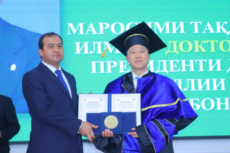 Ёдовар мешавем, ки унвони ифтихории «Доктори фахрӣ»-и Донишгоҳи давлатии омӯзгории Тоҷикистон имсол таъсис дода шуда, бори нахуст ба президенти Донишгоҳи миллии Ҷонбук О-Бонг Янг супурда шуд.