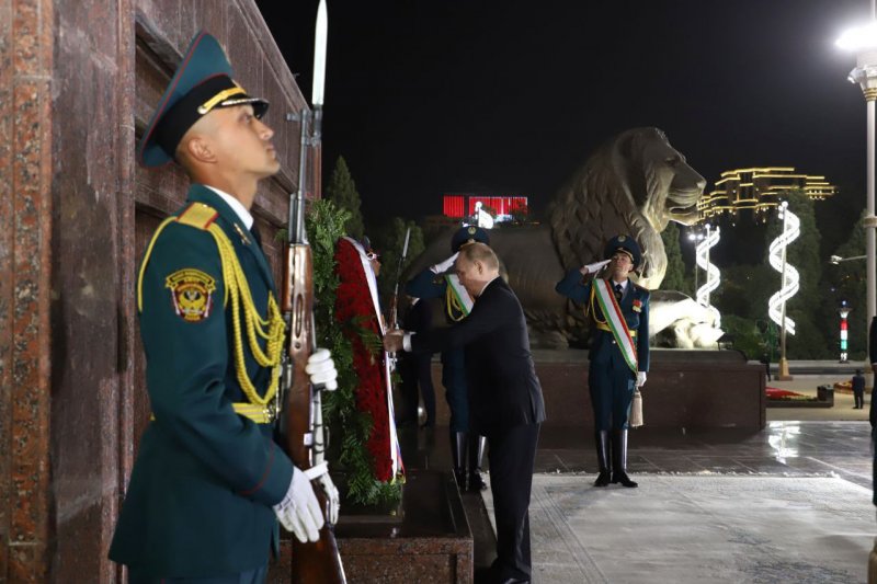 ДУШАНБЕ, 08.10.2025 /АМИТ «Ховар»/. Президенти Федератсияи Русия Владимир Путин имрӯз дар доираи сафари давлатӣ ба Ҷумҳурии Тоҷикистон ба майдони «Дӯстӣ»-и шаҳри Душанбе ташриф оварда, дар пояи муҷассамаи асосгузори давлати тоҷикон Исмоили Сомонӣ гулчанбар гузошт, хабар медиҳад мухбири АМИТ «Ховар».