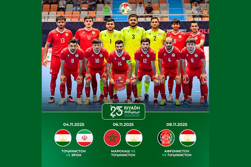 ДУШАНБЕ, 25.10.2025 /АМИТ «Ховар»/. Дастаи мунтахаби Тоҷикистон оид ба футзал таҳти роҳбарии Пайрав Воҳидов дар Бозиҳои ҳамбастагии исломӣ-2025, ки аз 4 то 11 ноябр дар шаҳри Риёз баргузор мешаванд, иштирок хоҳад кард.
