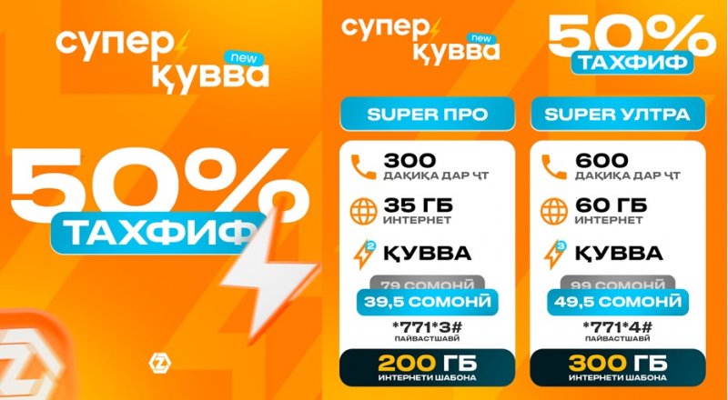 Дар доираи иқдом хати тарофаҳои «SUPER Қувва» бо тахфифи 50% барои шаш моҳ аз рӯзи фаъолсозӣ дастрас мебошад. Ин имконияти беҳтарин барои муштариёни нав аст, то сифати баланди ширкати ZET-MOBILE ва шароити фоиданокро эҳсос намоянд.