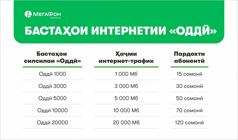 Бо интихоби яке аз бастаҳои нав муштарии ширкати «МегаФон Тоҷикистон» ҳаҷми зарурии интернетро бо нархи муфид ба даст меорад ва метавонад бо назардошти талаботи худ имкониятеро осон, мувофиқ ва бе шартҳои зиёдатӣ ба даст оварад.