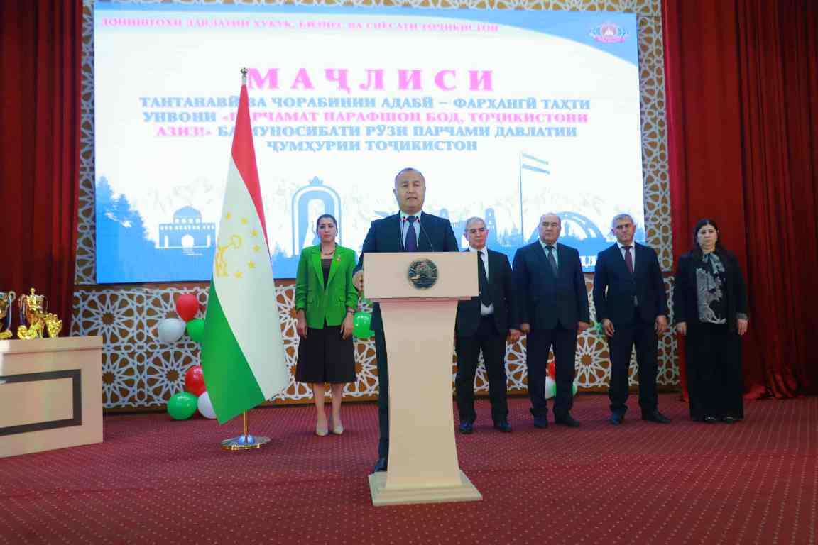 ДУШАНБЕ, 24.11.2025 /АМИТ «Ховар»/. Дар Донишгоҳи давлатии ҳуқуқ, бизнес ва сиёсати Тоҷикистон ба ифтихори Рӯзи Парчами давлатии Ҷумҳурии Тоҷикистон маҷлиси тантанавӣ доир шуд, хабар доданд ба АМИТ «Ховар» аз ин донишгоҳ.