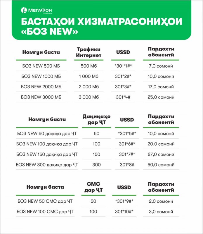 Бастаҳоро метавон дар тарофаҳои амалкунанда тавассути замимаи «МегаФон Life», ҳуҷраи шахсӣ, бо ёрии USSD-дархостҳо ё дар наздиктарин идораи хизматрасонии ширкат пайваст намуд. Маълумот оид ба бастаҳои «БОЗ NEW» дар ҷадвали зерин оварда шудааст: