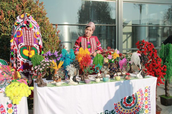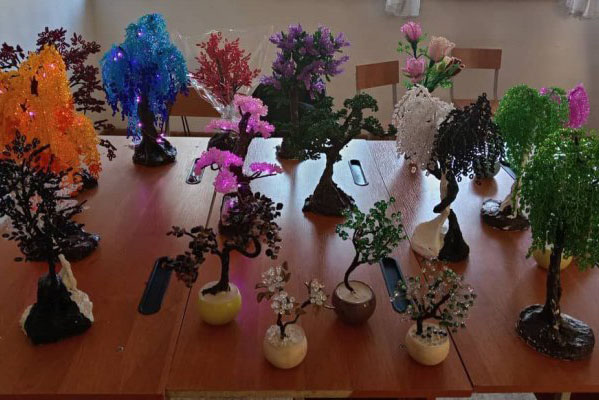 Заррина аз муҳраҳои рангоранг ва симу риштаҳои махсус дар шакли дарахт армуғонҳо омода мекунад.