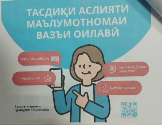 Мувофиқи тартиби нав, шаҳрвандон баъди гирифтани маълумотномаи вазъи оилавӣ аз бахшҳои сабти асноди ҳолати шаҳрвандии шаҳру ноҳияҳо метавонанд барои тасдиқи аслияти он ба сомонаи расмии Вазорати адлия ворид шуда, дар равзанаи «Маълумотнома — тасдиқи аслияти маълумотномаи вазъи оилавӣ» маълумоти заруриро пур намоянд. Ариза тавассути ин портал ба таври электронӣ ба вазорат ирсол мегардад.
