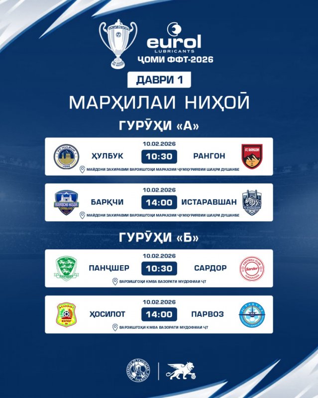 Қисми ниҳоии Ҷоми ФФТ-2026 аз 10 то 20 феврал бо иштироки ҳашт даста доир мешавад. Бозиҳо дар майдони эҳтиётии Варзишгоҳи марказии Душанбе ва инчунин дар майдони сунъии варзишгоҳи КМВА баргузор мегарданд.