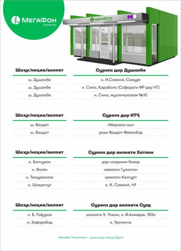 Ҷамъи 11: МегаФон Тоҷикистон шабакаи идораҳои хизматрасонӣ ба муштариёнро васеъ менамояд