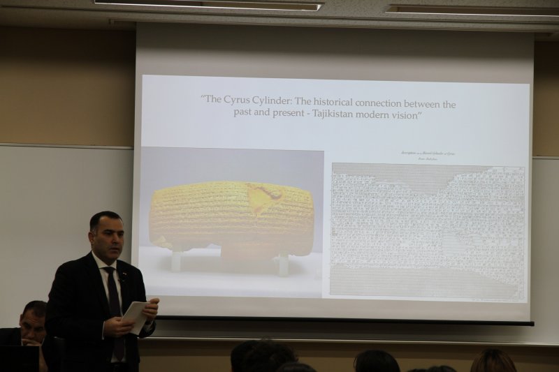 Сафири Фавқулода ва Мухтори Ҷумҳури Тоҷикистон дар Ҷопон Фарҳод Салим оид ба ташаббусҳои байналмилалии Президенти Ҷумҳурии Тоҷикистон муҳтарам Эмомалӣ Раҳмон, аз ҷумла қабули қатъномаи ЮНЕСКО таҳти унвони «Устувонаи Куруш: Эъломияи ибтидоии ҳуқуқи башар ва гуногунрангии фарҳангӣ» ва қатъномаи СММ оид ба эълон намудани соли 2027 «Соли байналмилалии маърифати ҳуқуқӣ» маълумот дода, нақш ва аҳаммияти онҳоро шарҳ дод.