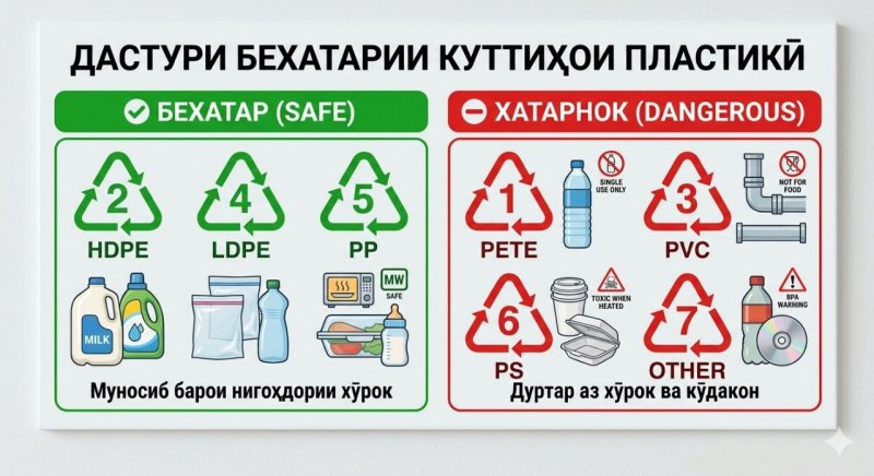 – Дар қисмати поёнии ҳар зарфи пластикӣ (дар таҳаш) як секунҷаи хурд ва дар дохили он рақамҳои аз 1 то 7 вуҷуд дорад. Ин рамзгузорӣ на танҳо барои коркарди дубора, балки барои муайян кардани дараҷаи бехатарии мавод барои саломатӣ тарҳрезӣ шудааст, аммо мо истифодабарандагон дар аксар ҳолат онро нодида мегирем.