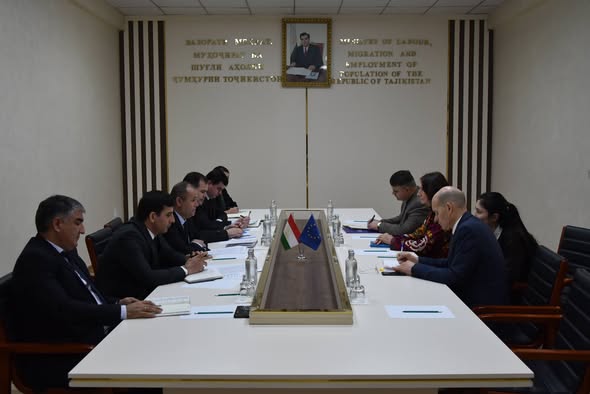 دوشنبه، 22.01.2026. عبدالرحمان عشورعلی زاده، معاون وزیر کار، مهاجرت و اشتغال جمهوری تاجیکستان با وینسنت بیگوت، نماینده دفتر مرکزی اتحادیه اروپا در بروکسل دیدار و گفتگو کرد.