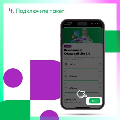 После того, как наполнение пакета будет полностью отвечать вашим задачам, нажмите кнопку «Подключить». Тариф «Включайся! Создавай Life 2.0» в нужной вам версии будет активирован. Для удобства абонентов также доступна функция переподключения тарифного плана.