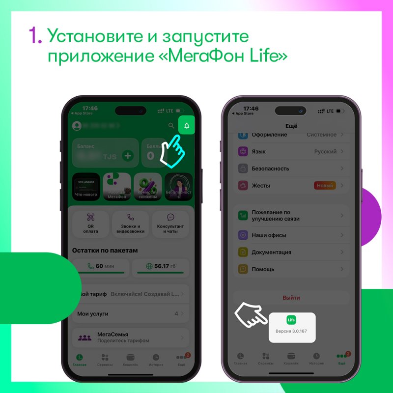 Скачайте официальное приложение «МегаФон Life» из App.Store или life.tj. Установите его на свой смартфон и войдите, используя номер телефона и пароль или через SMS-код. Пользователям, у которых уже установлено приложение, необходимо убедиться, что оно обновлено до последней версии. Уведомления об обновлении приложения отображаются в значке с колокольчиком в правом верхнем углу экрана. Актуальную версию приложения также можно посмотреть, зайдя в раздел «Ещё» в нижнем правом углу. Номер версии указан в самом низу экрана.