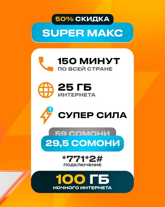 • Super Макс — 59 сомони ➝29,50 сомони (#7712#*);
