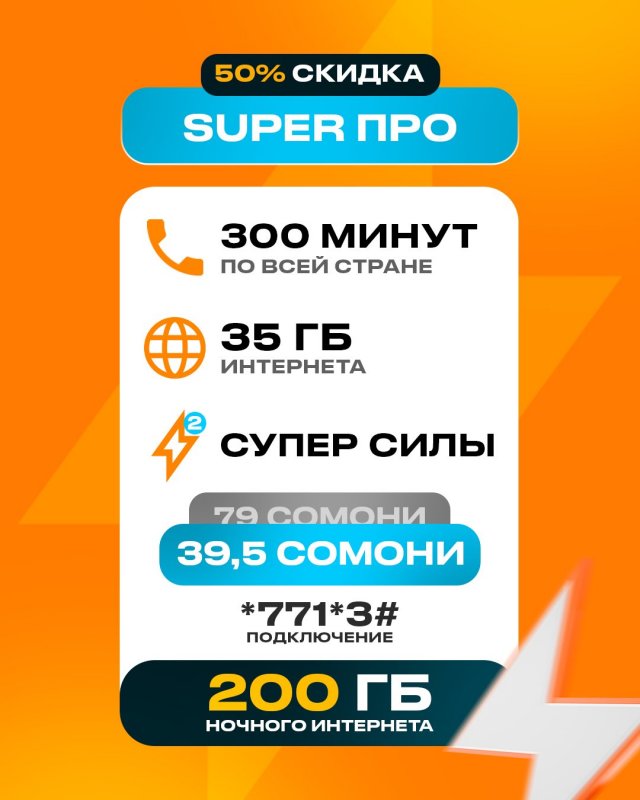 • Super Про — 79 сомони ➝39,50 сомони (#7713#*);
