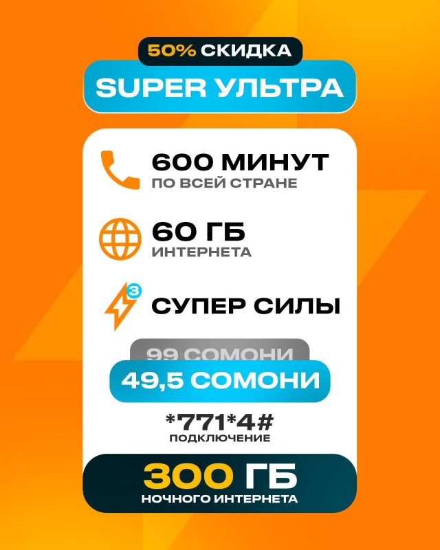 • Super Ультра — 99 сомони ➝49,50 сомони (#7714#*).