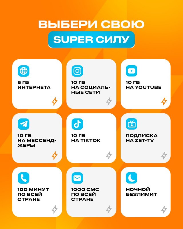 +5 ГБ Интернета, +10 ГБ для мессенджеров, соцсетей, YouTube или TikTok, +100 минут по Таджикистану, +1000 SMS, +300 ГБ ночного Интернета, а также подписка на ZET-TV сроком на месяц.