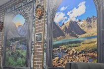 Стены чайханы украшены красивыми таджикскими узорами, элементами национальной резьбы и картинами горных пейзажей Таджикистана, создавая тёплое, душевное пространство и культурную атмосферу. Эти украшения не только привлекают внимание, но и олицетворяют высокое архитектурное мастерство и эстетизм таджикского народа.