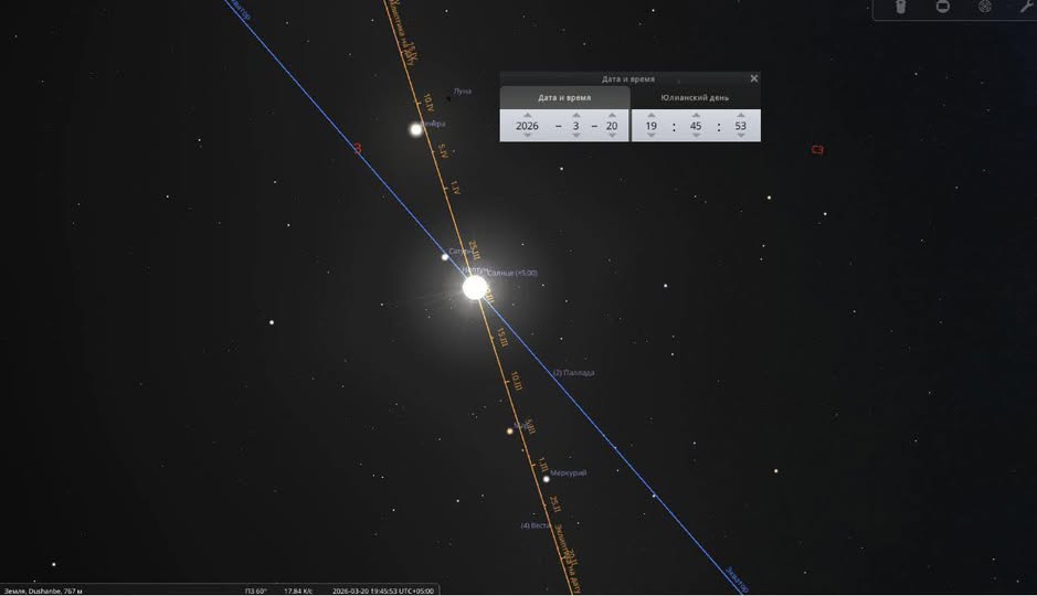 На изображении, созданном с помощью программы Stellarium, показано положение Солнца в момент наступления Навруза. Солнце находится в точке равноденствия и в точке пересечения эклиптики и небесного экватора.