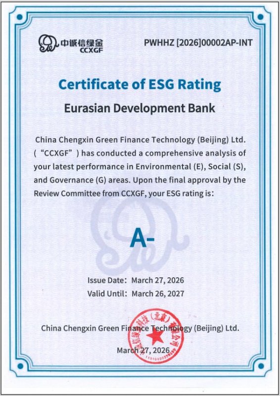 ДУШАНБЕ, 15.04.2026 /НИАТ «Ховар»/. Евразийский банк развития получил ESG-рейтинг «А-» от «China Chengxin Green Finance Technology», что является высоким показателем по шкале агентства, сообщает пресс-центр банка.